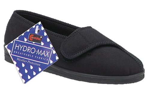 A wide opening slipper from Comfylux for those wider or swolen feet, machine washable trilobal uppers with a touch & close fastening with a water resistant upper on a tradional vulcanised rubber sole
